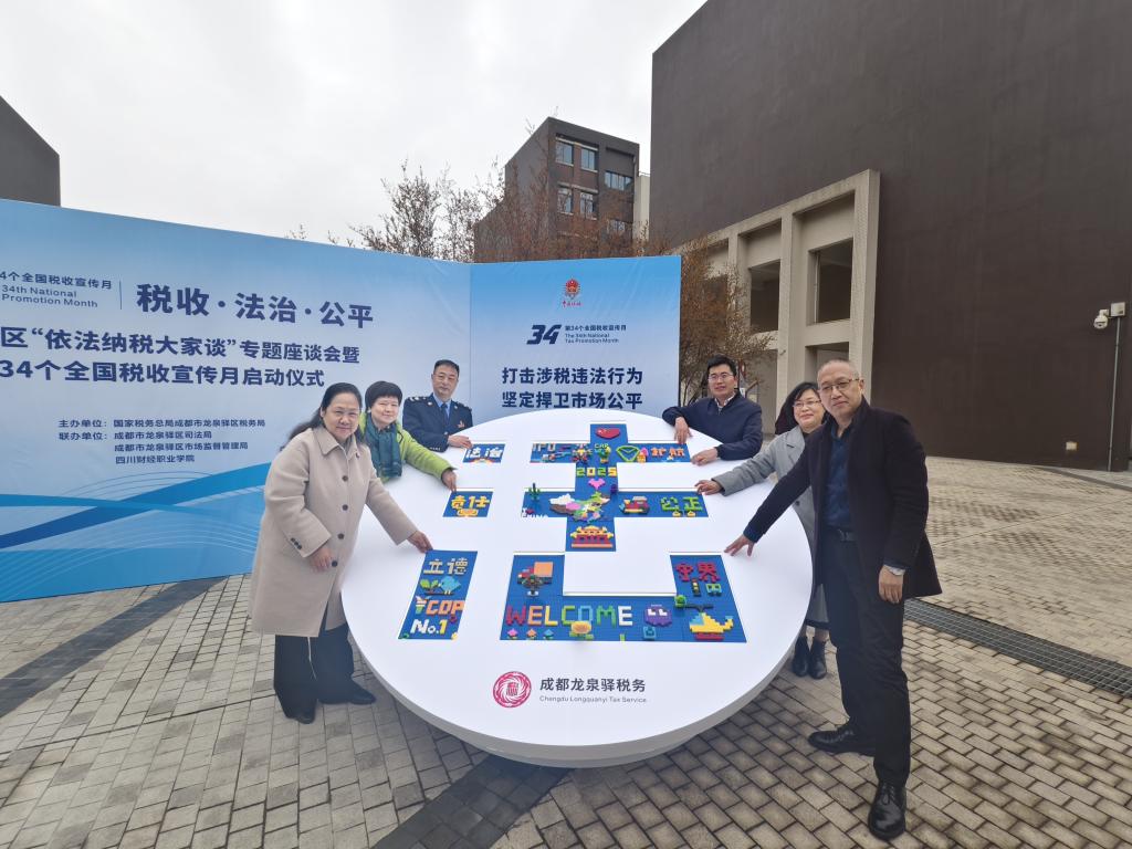 随后,张华与参会领导嘉宾共同拼图汇聚成“法”字,以词幅凝聚法治精神与社会责任,共同开启税收宣传月的同心篇章。