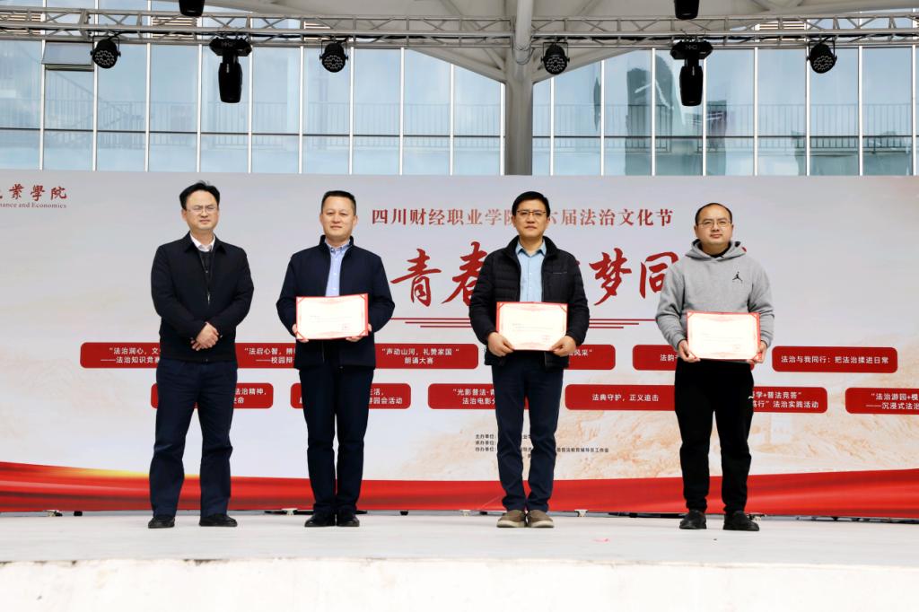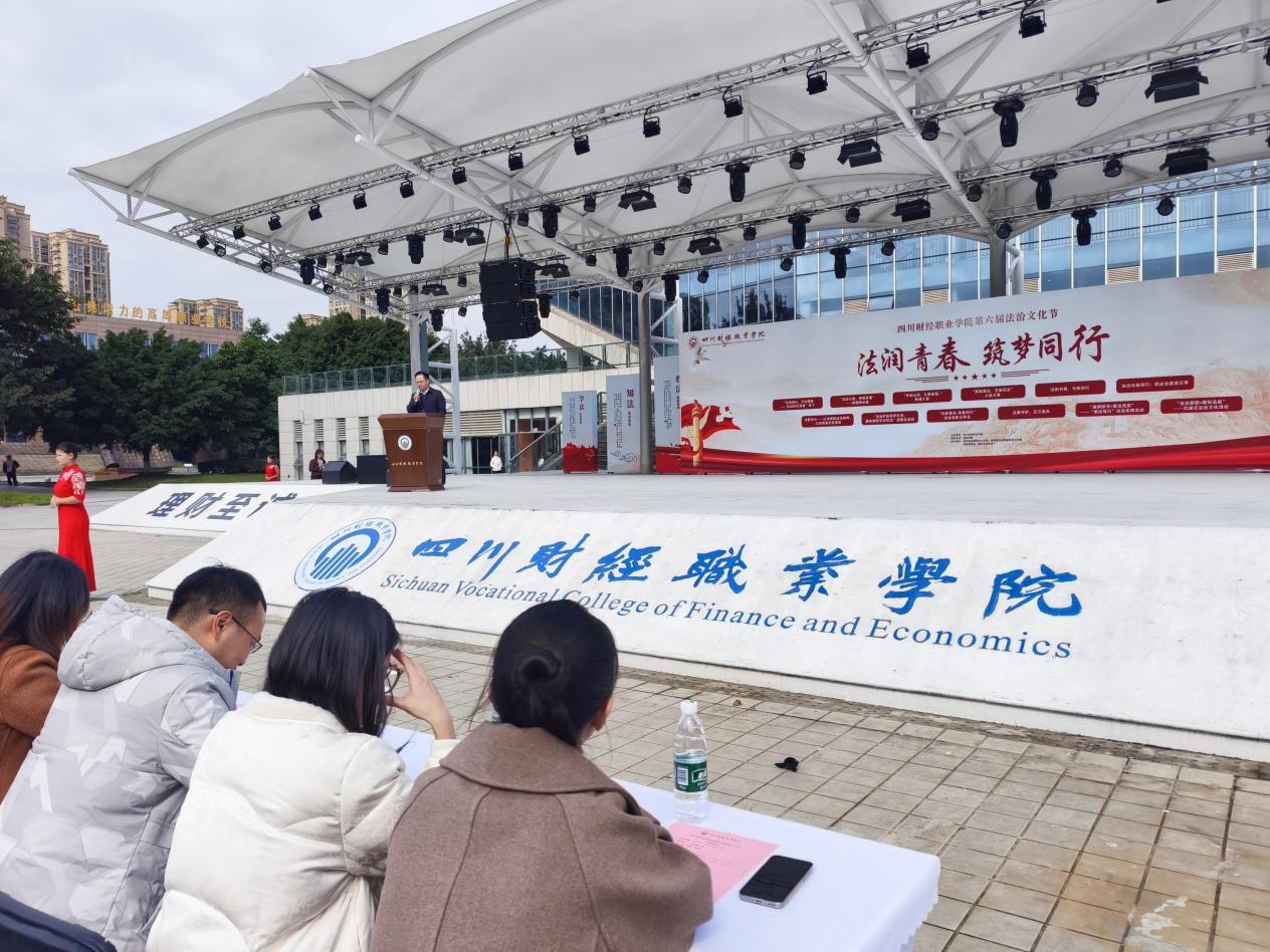 11月18日,学校第六届法治文化节在红石榴广场正式拉开帷幕。龙泉驿区人民法院相关业务庭庭长张林、四川法治报成都新闻部主任曾昌文、中国移动通信集团四川有限公司龙泉驿分公司副总经理张庆慧、四川中砝会计师事务所办公室主任兼党支部副书记李永强,以及学院纪委书记李洋、党委学生工作部部长田刚成、财税学院院长杨毅、财税学院党总支书记陈露、财税学院副院长罗艾等领导嘉宾出席开幕式,与学校近300名师生共同见证这一重要时刻。活动在活力四射的开场舞《再次重逢的世界》中拉开序幕,欢快的节奏瞬间点燃全场气氛,现场掌声与欢呼声此起彼伏。