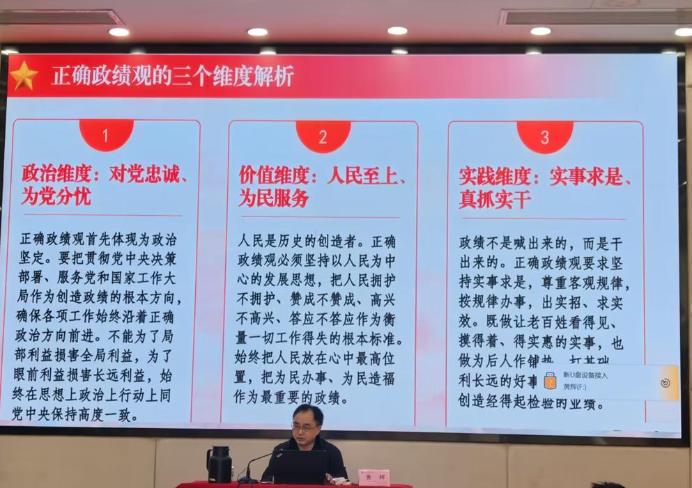 报告会上,黄辉教授紧扣主题,立足理论高度、实践深度和现实角度,系统阐释了正确政绩观的核心要义、丰富内涵、实践要求。结合鲜活案例和工作实际,深入浅出解读了树立和践行正确政绩观的重大意义和路径方法。他指出,树立正确政绩观,起决定性作用的是党性,要立足本职、求真务实、久久为功,坚决摒弃形式主义、官僚主义,多做打基础、利长远、惠师生的实事,以实干实绩推动高质量发展。整场报告内容详实、语言生动,既有理论阐释,又有实践指导,具有很强的政治性、思想性和指导性。