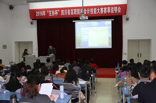 2016年3月18日下午,2016年“注协杯”四川省高职院校会计技能大赛赛事说明会在我院B211阶梯教室顺利召开。大赛赛项执委会委员、7790cnm必发集团副院长易思飞,大赛赛项执委会委员、大赛专家组副组长、内江职业技术学院副院长刘江,大赛赛项执委会办公室主任、专家组成员、7790cnm必发集团实训中心主任叶剑明,大赛赛项执委会办公室副主任、7790cnm必发集团对外合作处处长游秋琳,厦门网中网软件有限公司产品经理潘皖,新道科技股份有限公司四川分公司技术总监陈自洪,以及来自全省近90名参赛院校指导教师代表参加了本次说明会。会议由大赛专家组成员、四川商务职业学院会计系主任李莉主持。