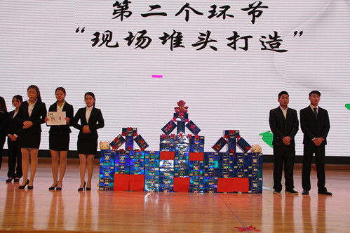 一个营销方案是否能取得成功,少不了现场造势与推广,而此次比赛的第二个环节正是“现场堆头打造”。在各个队伍拿出看家本领进行团队堆头打造的同时,有奖问答环节也在同时进行着,场下观众踊跃向场上的选手提问,选手们在完成作品的同时还要兼顾回答观众提出的问题,瞬间将现场气氛推向高潮。15分钟后,各个团队的堆头作品也完成了,他们的作品形式各样,宫殿、长城、圣诞树等形象被活灵活现的展现在观众面前,充分展示了参赛选手们丰富的想象力。如此短的时间取得如此成效,更体现了团队合作的默契。