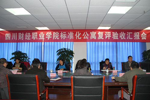 2015年12月10日,四川省高校后勤协会公寓与物业专业委员会标准化公寓评估专家组莅临我院对学生公寓1、2、3、4栋进行标准化公寓复评验收。学院党委副书记、院长黄吉秀同志致欢迎辞,党委委员副院长李跃进同志就我院标准化学生公寓创建情况作了汇报,党政办、学工部、后勤管理处、保卫处、财务处等相关处室负责人参加了会议。