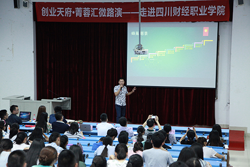 接下来,由成都光谷创业咖啡代表景岗山为同学们讲解了政府关于对大学生创新创业的帮扶政策,让大家了解了政府给予大家创业的优越环境和激励政策。随后“蜂巢健康养老服务平台”联合创始人王周发表了演讲,他为大家分享了他的创业心得与一些独到的创业经验。然后即进入了本次活动的主题——创业项目路演。