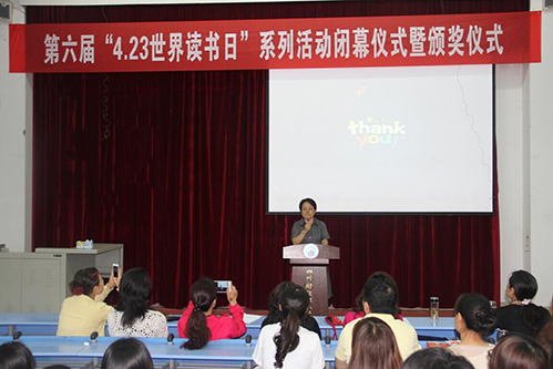 会上,傅丽馆长对本届“4.23世界读书日”举行的系列活动开展情况和取得的成效进行了总结汇报,对各位领导、老师们的支持和同学们的积极参与表示了感谢。
