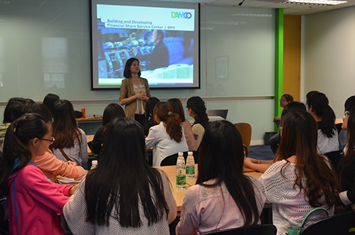 下午2点,全班45名同学在辅导员吴琳老师的带领下乘校车到达公司所在地。北亚区成都财务中心副总经理伍馨燕热情地接待了同学们,并带领同学们到专设的会议室进行相关课程的培训。培训课由伍总经理和赵经理两位为大家讲授。上课内容包括丹马士作为财务共享中心的建立、发展及员工在财务共享中的职业发展情况。具体涉及到丹马士公司上海总部选址在成都建立财务共享中心的意义和发展情况,以及丹马士作为一家世界500强企业在管理模式上所体现出来的先进理念。课后,授课老师与同学们进行了互动,同学们踊跃的提问和发言,如有同学问到,如何成为企业的团队小组长,以及应该具备的条件;工作中有没有轮岗的机制等。伍经理对同学们的问题进行了详细解答。最后,公司的部分高管们带领全班的同学对丹马士公司的工作环境进行了参观,并安排在丹马士工作的往届毕业生与同学们进行了交流。