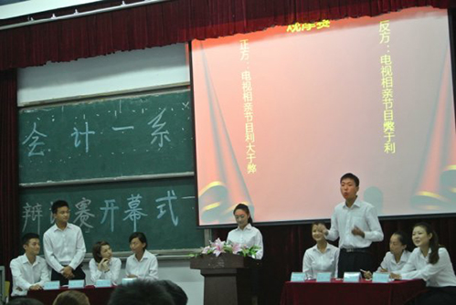为迎接学院第八届“财经杯”大专辩论赛,2013年9月17日14时,会计一系在教学楼B213举行了辩论观摩赛。系学生党支部书记吴峥出席了本次辩论赛,系学生会干事及全系各班班委观摩了整个比赛。