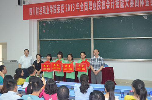 大会伊始,参赛领队会计系副主任马会起向大家介绍了比赛情况。本次在山西财政税务专科学校举行的全国高职院校会计技能大赛是全国最高规模的高职院校会计技能大赛,由国家教育部、财政部等32个部委举办,有全国30个省、自治区、直辖市30支代表队,120名参赛人员参加;会计技能大赛比赛包括会计手工处理和业务信息处理两项内容;我院彭思琴等4名学生代表四川省参加比赛,取得团体594.06分,以高出第二名58.02分的绝对优势卫冕团体金奖,为四川省和学院争得了巨大荣誉。