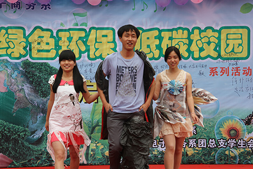 在我系文艺队为大家带来热情的开场舞后便迎来了本次活动的中心——环保T台秀。走秀模特向在场领导及同学们展示了由报纸,塑料袋,旧布料等废弃物制成的礼服、短裙、帽子等。各色服装凝结了学生的创新与智慧,用实际行动彰显了“绿色环保”的主题。