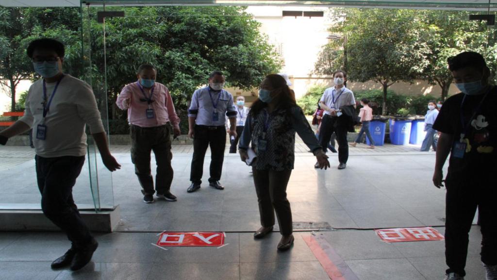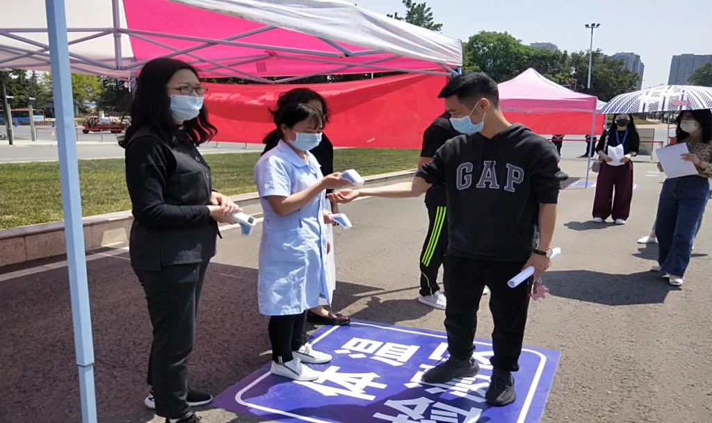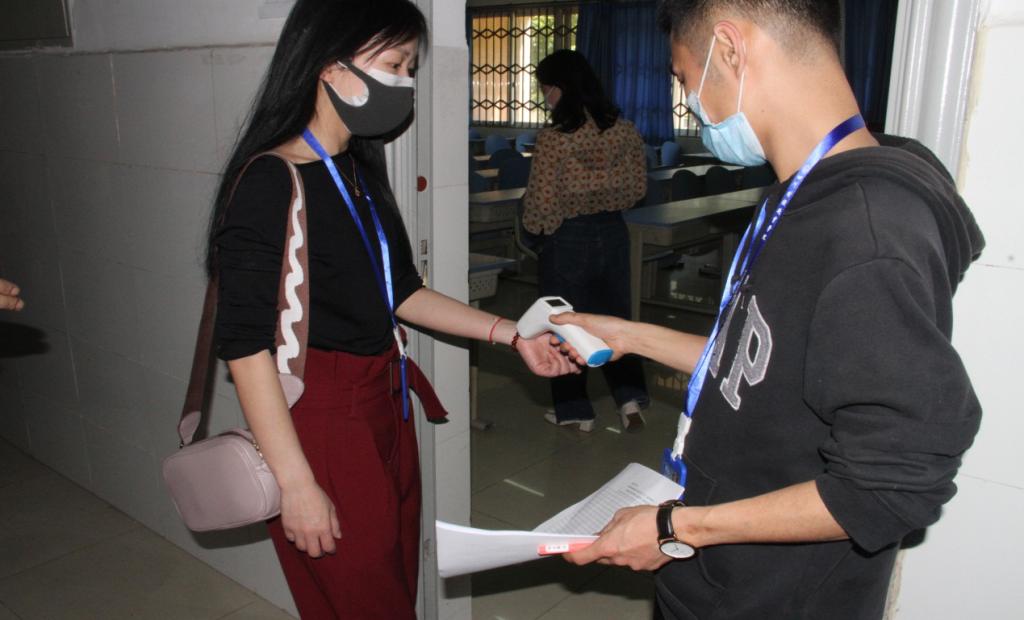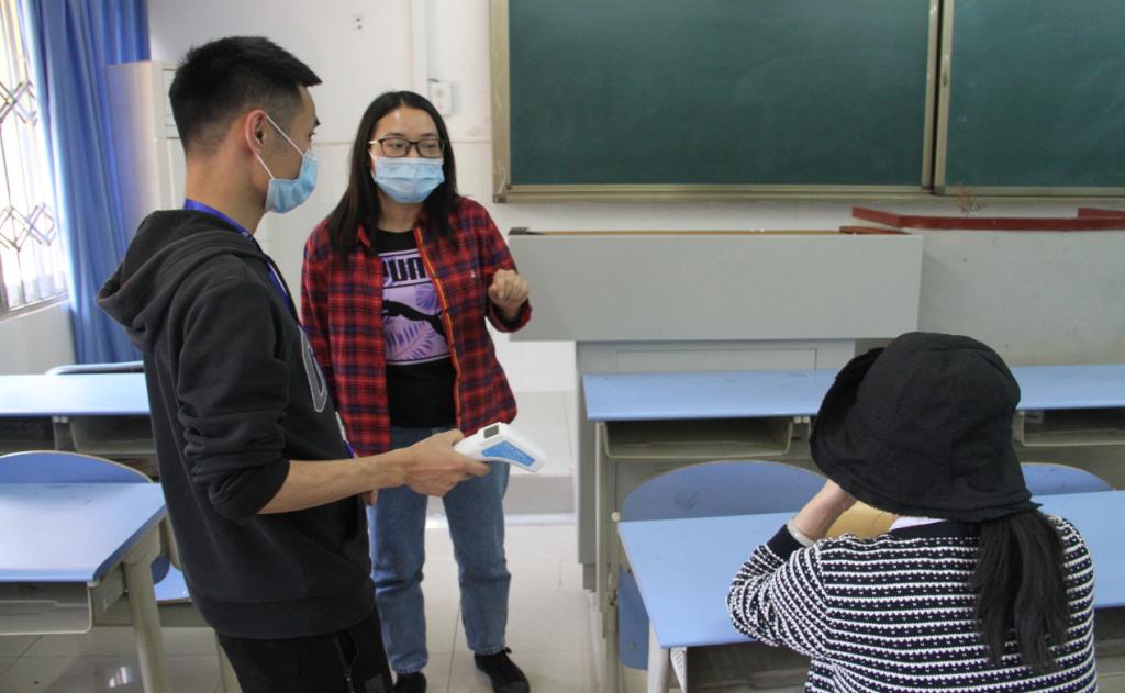 1.学生佩戴口罩,在教室门口由班委干部(辅导员扮演)组织进行体温检测。