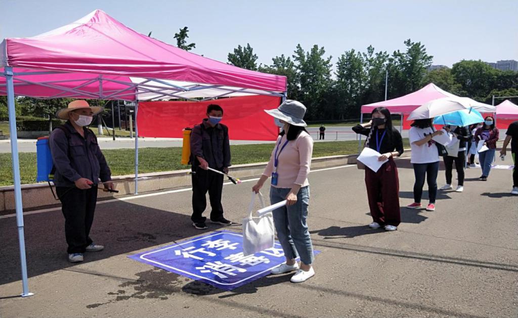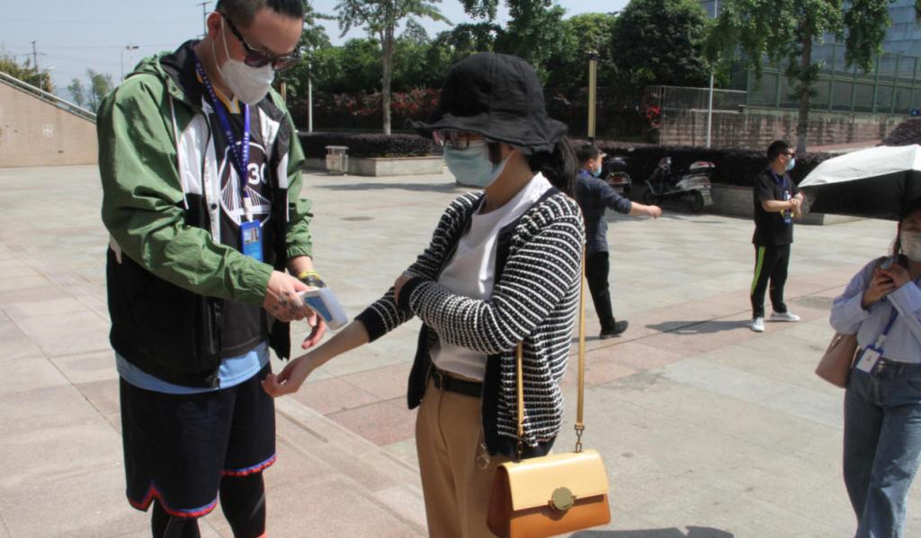 3.每条通道的检测人员在两边用测温仪对学生逐个进行体温检测,消毒人员对学生鞋底、书包、行李箱等物品进行消毒。