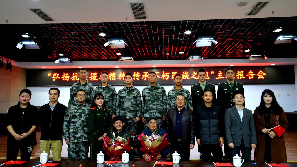 最后,报告会在电影《上甘岭战役》主题曲《我的祖国》的全场大合唱中落下帷幕,师生代表为李代模和薛清明两位老英雄献上鲜花致谢,并祝福两位战斗英雄身体健康,生活幸福!