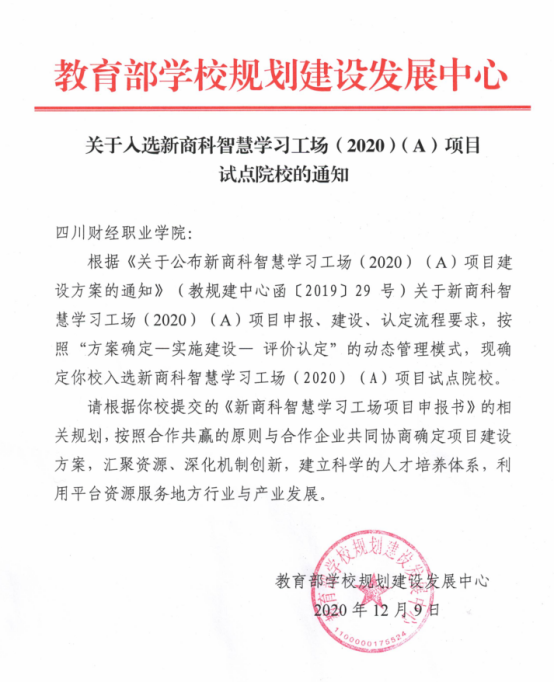 近日,教育部学校规划建设发展中心公布了“新商科智慧学习工场”项目2020年第三批试点院校名单,全国共有9所高职院校入选,其中我院是四川省唯一入选的高职院校。