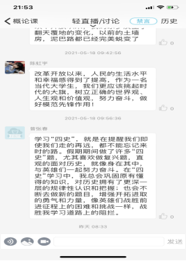 通过同上“四史”思政大课,坚定了同学们争做高举旗帜、勇于担当、胸怀全局的有为青年的。不负青春、不负韶华、不负时代,铭记新中国历史,走好人生道路,为实现中华民族伟大复兴贡献出自己的力量。