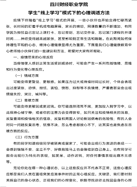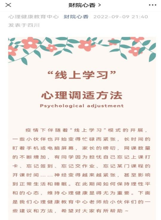 运用“财院心香”公众号,开展心理咨询服务、推送心理健康知识和心理调节方法。为了关心学生们“线上学习”的情绪状态和学习效果,针对一些学生因为长时间的盯着手机或电脑屏幕,家长的唠叨,网课数量的不断增加等变得忙碌而紧张,甚至影响到正常生活和睡眠。在此期间如何保持理性平和的心态,维持心理健康显得尤为重要。