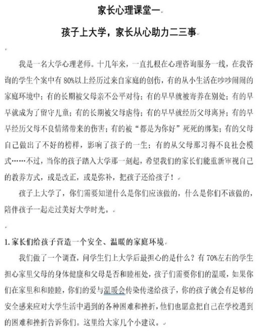 加强家校联系机制,开设家长心理课堂。孩子上大学了,家长们不是送到学校就一切不管,为了陪伴孩子一起走过美好大学时光,家长需要做些什么,不能做些什么,心理中心将通过开设家长心理课堂系列,让家长们了解孩子,与学院共同关心孩子的健康和成长。