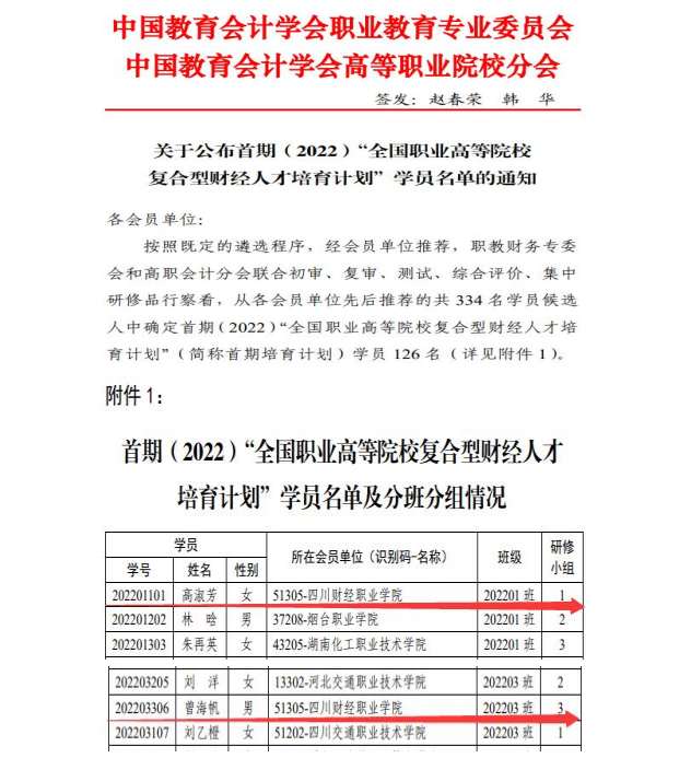 9月30日,中国教育会计学会职业教育专业委员会和中国教育会计学会高等职业院校分会公布了首期(2022)“全国职业高等院校 复合型财经人才培育计划”学员名单,我校高淑芳、曾海帆通过初审、复审、测试、综合评价、集中研修品行察看等一系列测评后入选该计划。