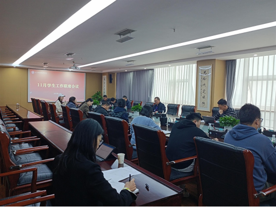 会上首先组织学习上级学生工作相关文件,听取了各二级学院近期学生管理教育经验做法,意见和建议。与会相关职能部门对二级学院反馈的情况进行了相应回复,内容涉及疫情防控、国家奖助学金评定、毕业学生就业培训、后勤保障、常规管理、一站式书香社区建设等。随后,学生工作部对11月的学生工作进行具体工作安排,要求各二级学院迅速掀起党的二十大学习,学深悟透党的二十大精神,营造浓厚学习氛围;学工人员要积极践行一线原则,丰富学生第二课堂方式和内容;加强学生常规事务的管理,及时了解学生合理诉求;加强对特殊学生的关心关爱,时刻绷紧安全这根弦,消除各类风险隐患,共同守护广大师生身心健康和校园稳定。