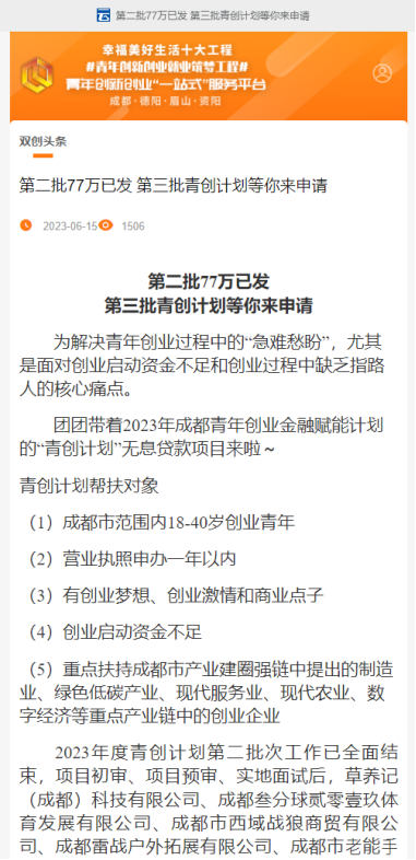 2023年6月15日,成都团市委向社会公布“第二批青创计划”审批通过名单。“青创计划”旨在解决青年创业过程中创业启动资金不足和创业过程中缺乏指路人的核心痛点,扶持对象为18-40岁创业青年,营业执照申办一年以内,创业启动资金不足,成都市产业建圈强链中提出的制造业、绿色低碳产业、现代服务业、现代农业、数字经济等重点产业链中的创业企业。