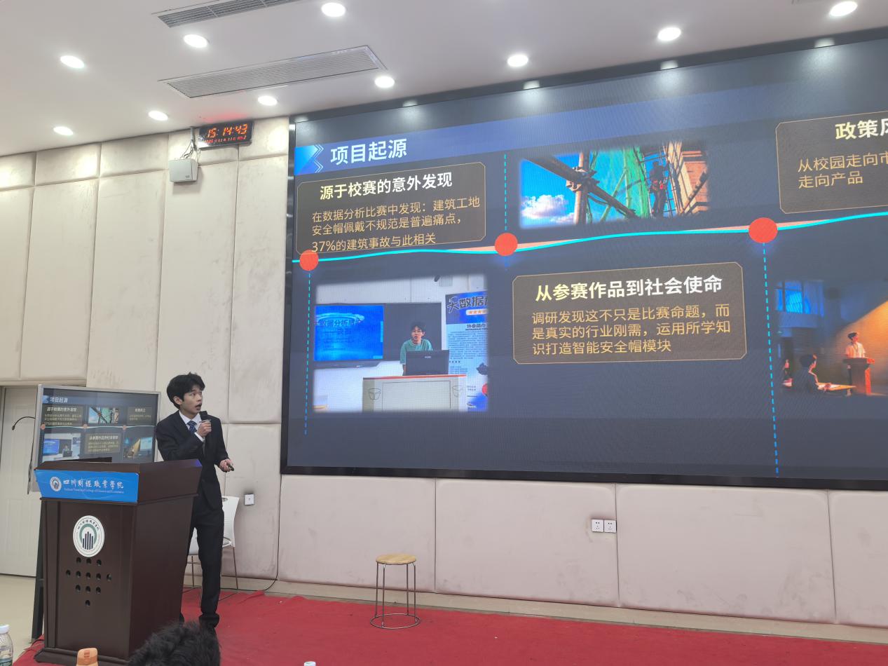 比赛尾声、上合组织青年创业智库专家张博士作为评委代表发表点评。他首先对本次大赛的整体质量给予高度认可:“从红旅赛道的项目中、我们看到了川财学子强烈的社会责任感——无论是助力乡村振兴的‘宿写新篇’、还是关注特殊群体的‘时光益站’、都体现了‘把论文写在祖国大地上’的实践精神;而职教赛道的项目则展现了扎实的专业功底与技术创新力、‘智旋盾’的专利技术、‘智盔云盾’的产业适配性、都紧扣市场需求、具备良好的落地潜力。”