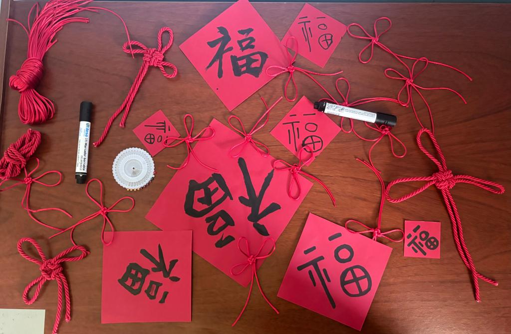 在传统民俗体验环节,张健老师带着当地学生体验了中国春节传统民俗,现场氛围热烈温馨。学生们在红色卡纸上认真书写“福”字,动手编织吉祥中国结,跟着旋律学唱中文新年歌曲,学说中文吉祥话送新春祝福。孩子们在动手动脑动嘴中近距离触摸中国民俗,感受了中华优秀传统文化。