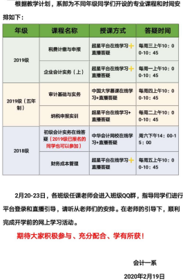 科学规划勤备战,合理安排显实效。为确保学生学习效果,会计一系自2月10日线上教学筹备视频会议后,在系主任、系党总支书记杨勇和副主任陈娟的带领下,充分把握“停课不停教”“停课不停学”的科学内涵,按照教育部、省教育厅以及学院抗疫精神和线上授课统一要求,坚持“线上行课有重点,授课学习无负担”原则,与各教研室主任和课程负责人多次视频会议商讨,在原春季课表的基础上,根据课程特点和教学计划,开展7门课程线上教学。其中:2019级普通班级为《企业会计实务(上)》和《税费计缴申报》、2019级五年制班级为《审计基础与实务》和《纳税申报实训》、2018级为《财务成本管理》和助力备考初会的《初级会计实务》线上答疑。另外,杨勇老师牵头开设的《高级会计》线上直播课程,于2月17日、2月24日开通直播以来,原本40人的选修课,已增至1300多人,包括全校相关专业大二、大三学生、学院相关系部财务税务专业的老师,四川财经职教联盟所属40多所院校的老师以及重庆、贵州、云南等兄弟院校的部分老师,杨勇老师的直播课堂成了真正的会计大讲堂。