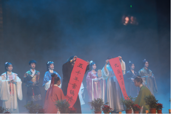 接下来,由我院汉服社、书法协会、茶艺社联合带来表演《江州行》,表演者们身着汉服、手执毛笔,将书法与古典舞蹈结合,为观众带来了一场汉服与书法的视觉盛宴。紧接着,由四川长江职业学院、四川国际标榜职业学院分别带来舞蹈表演《Show me》和《I'm not cool》,将现场气氛推向高潮,现场掌声连绵不断,观众们纷纷拿起手中的荧光棒,为之欢呼。我院山海话剧团带来的情景剧《聚,是一团火》,以疫情为主题,展现了疫情严重之时,伟大志愿者们主动请缨,奋战一线的奉献精神,令现场观众热泪盈眶。