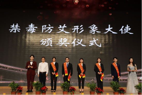 为加强大学生对艾滋病的认识,提高大学生的禁毒意识而举办的“大学生禁毒防艾形象大使选拔赛”的获奖人员也随之公布,龙璇、刘沁怡等同学上台领奖,符刚副院长上台为他们颁奖,鼓励同学们为宣传禁毒防艾作出更多的贡献。