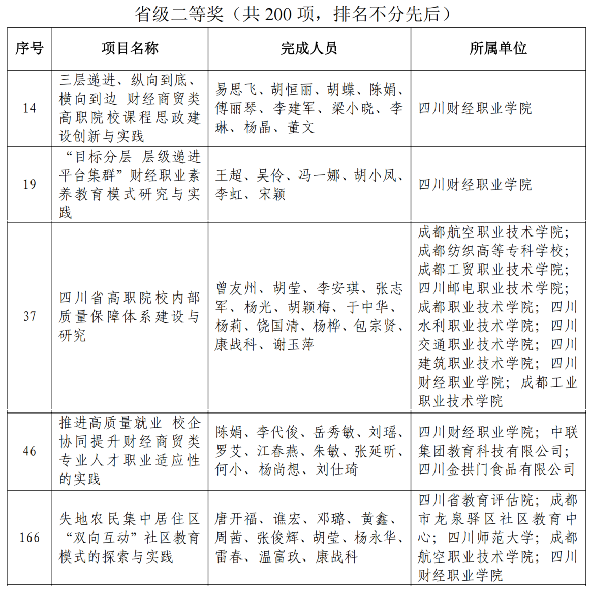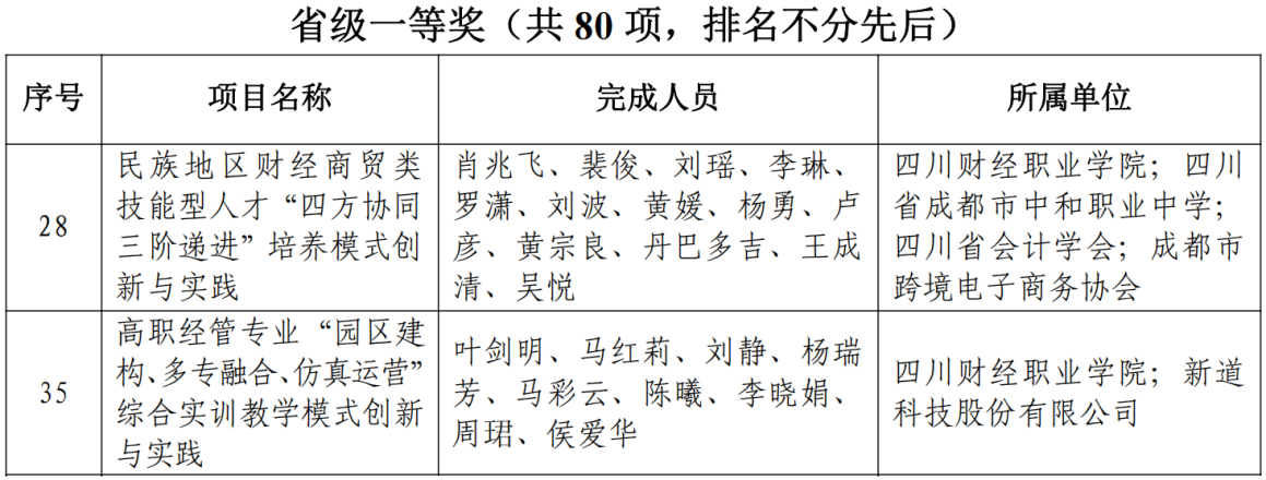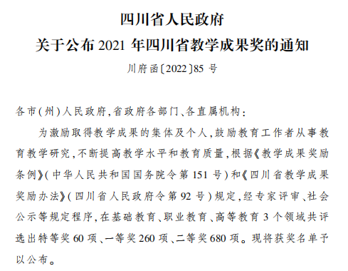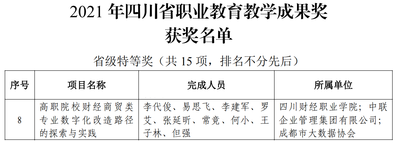 2022年4月11日,四川省人民政府公布了2021年四川省职业教育教学成果奖获奖名单,我院推荐的《高职院校财经商贸类专业数字化改造路径的探索与实践》等6项教学成果全部获奖,其中特等奖1项,一等奖2项,二等奖3项;学校教师参与的2项获得二等奖,共计8个奖项,取得历史性突破,获奖等级和总数均创新高!