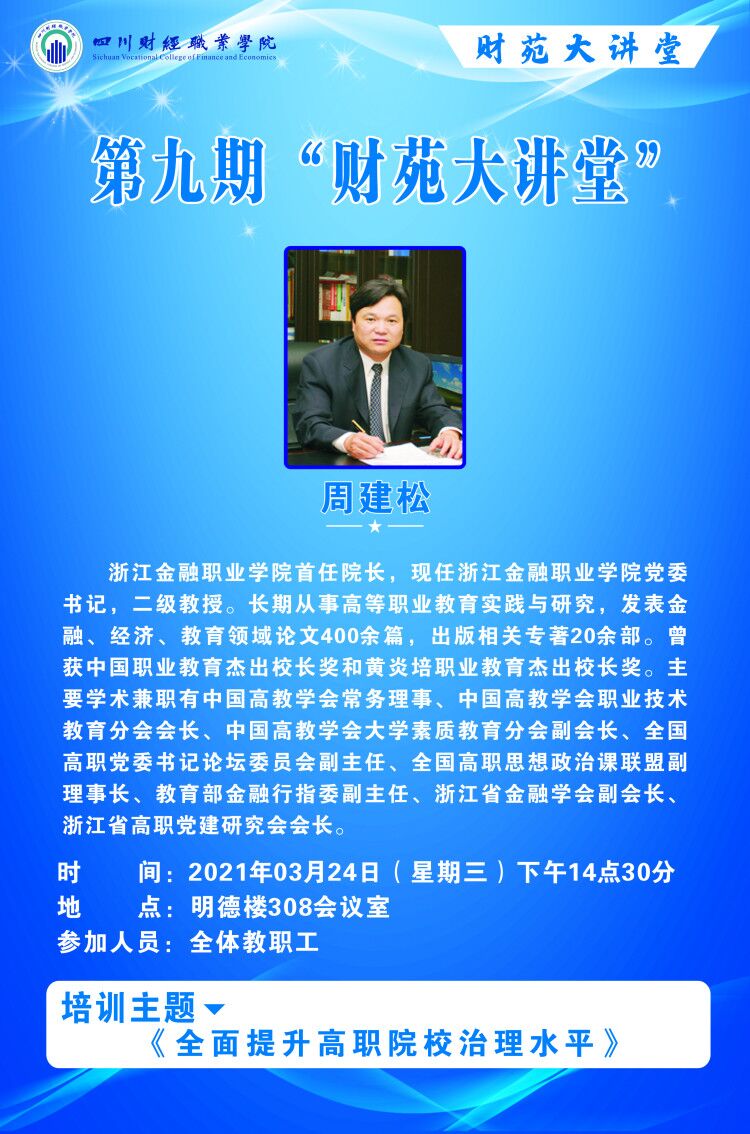 为全面提升高职院校治理水平,进一步助力学校发展,学校特邀请浙江金融职业学院党委书记周建松教授为大家开办讲座,讲述如何提升高职院校治理水平,现将有关事项通知如下: