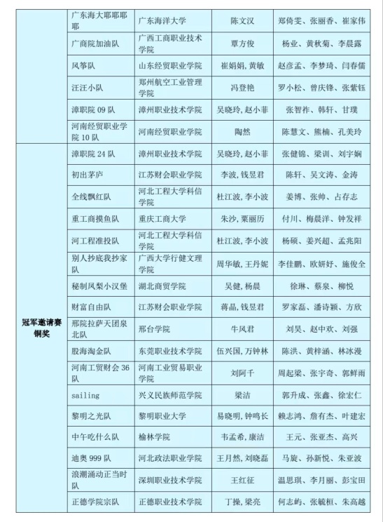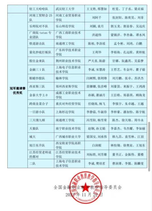 2022年11月18日,由全国金融职业教育教学指导委员会主办,河南经贸职业学院承办,东莞职业技术学院联合承办,深圳市天择教育科技有限公司为技术支持单位的第九届全国证券投资模拟实训大赛(冠军邀请赛)圆满落幕。本次大赛共计400多所院校参加,在经过前期18000多支队伍参加的全国赛激烈比拼后,选出53支成绩最优秀的队伍进行冠军邀请赛的最终角逐。在金融学院杨滢和李馨老师的专业指导下,由20级金融管理1班曾令洪、张敏和周亮三位同学组成的“三只韭菜”队在激烈的角逐中以第11名的好成绩荣获国家级银奖。