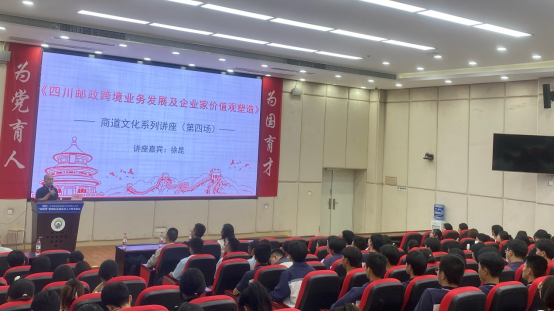 下午3:40,在B213阶梯教室开展商道文化讲座。中国邮政集团公司四川省分公司国际公司总经理徐昆为大家带来《四川邮政跨境业务发展及企业家价值观塑造》讲座。徐总以个人职业发展经历为主线,介绍了自己脚踏实地立足基层岗位,持之以恒坚持业务学习,洞悉先机把握发展机遇,造就了自己草根逆袭式的成长榜样。讲座中,他分享了集运仓快递物流案例:新冠肺炎疫情影响下,出现逆向海淘的现象,产生了集运仓快递物流模式创新,中国国际邮政企业利用其物流体系优势实现商业价值的转换。最后,他分享了人生感悟:身体健康第一、坚持学习求进、良好心态自励,鼓励同学们要关注跨境电商业态发展,对新生事物保持关注,把握住发展机会,在跨境电商业务找到自身的优势。讲座由总支书记郑代富老师主持,工商管理学院部分学生及来自四川天府新区职业学校和成都财贸职业中学的师生近200人参加。讲座结束后,二级学院负责人陈世平和相关老师一道看望了来访的中职学校师生。