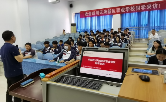 见面会结束后,四川天府新区职业中学的同学们在校园里游学。在二级学院学生会主席苟欣昱、组织部长曹魏琴引导下参观了学校图书馆、体育馆、校史馆、学习习近平新时代中国特色社会主义思想主题教育宣传展区、实习实训室等区域,对学校整体布局有了大致的了解,也对校园文化特色有了初步的认识。