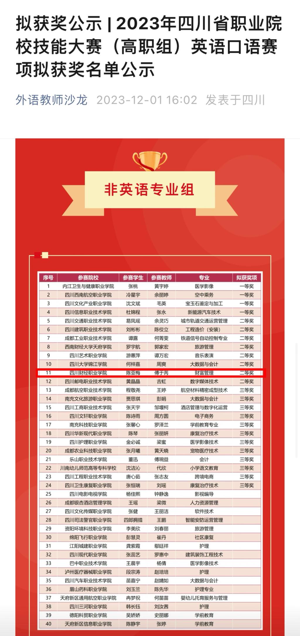 近日,2023年“中银杯”四川省职业院校技能大赛英语口语赛项圆满落幕。这是本赛项首次采用师生同赛赛制,我校傅于芮老师与2022级财富管理2班陈亚梅同学与英语专业师生同场竞技。历经两日的激烈角逐,不负众望,荣获了本项赛事的二等奖。这一成绩不仅体现了我校师生在英语应用能力上的高水平,更是我校课程思政建设和外语教学创新实践成果的有力证明。
