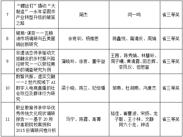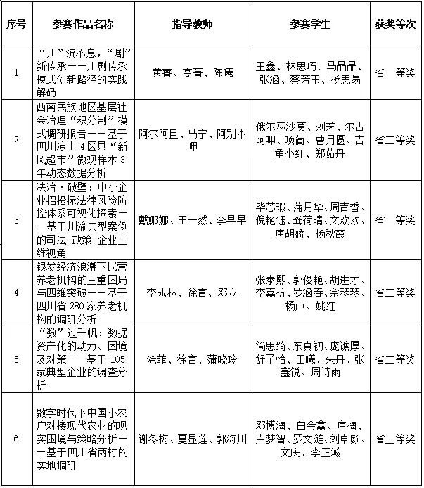 2025年5月24日-26日,第十八届“挑战杯”四川省大学生课外学术科技作品竞赛终审决赛在成都医学院成功举行。学校高度重视“挑战杯”竞赛工作,经校级初赛—专家培训—校级决赛答辩—入围省赛项目指导—模拟答辩等环节,我校共推报12个哲学社会科学类社会调查报告。11个获省级奖项,获奖率91.67%,其中省级一等奖1项、二等奖4项、三等奖6项。在“挑战杯”竞赛中获奖等级、获奖数量、获奖人数,均创新高。