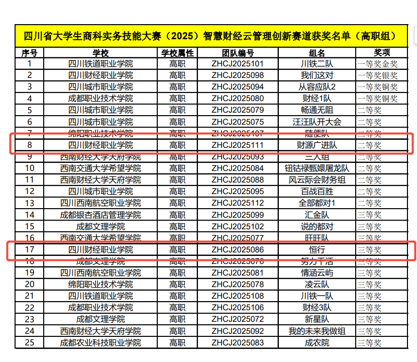 在10月12日落幕的“2025年四川省大学生商科实务技能大赛智慧财经云管理创新赛道省级竞赛”中,我校两支参赛队伍成功斩获省级奖项。此次赛事由四川省教育厅主办、西南财经大学承办,汇聚全省高校商科学生同台竞技。我校 “财源广进队”(队员:杨芳、任艳、吴丽玲;指导老师:肖潇、任思锜)脱颖而出,拿下省级二等奖;“恒行队”(队员:何佳、彭子又、郑倩雯;指导老师:胡秀梅、陈秋霖)凭借出色的实操表现,收获省级三等奖,充分展现了我校学子在智慧财经领域的实践能力与创新素养。