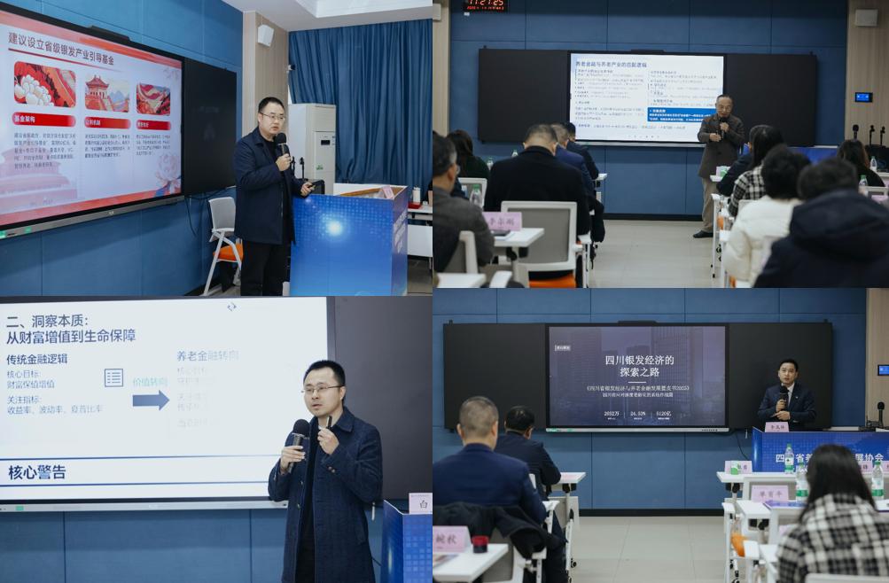 成立大会后,召开专题研讨会,四位专家围绕养老金融话题展开交流。雅安市财政局金融研究中心主任王坚分享地方实践经验,为区域性养老金融政策落地提供参考样本;成都市金融服务业商会会长石建昌提出,养老金融需跳出传统信贷模式,与养老社区、健康管理、智慧康养等场景深度融合;天府家族传承学院院长白云表示,要构建信托、保险、长期护理金融等多元服务体系,推动养老财富管理向“服务与生态导向”转型;四川省老龄委专家委员会委员李成林博士结合《2025年度四川省银发经济与养老金融发展蓝皮书》,剖析行业发展阶段性特征与趋势,建议加强政策协同与数据共享,健全风险防控机制。研讨期间,李成林博士与石建昌会长还向安徽、重庆等地高校学者赠送蓝皮书,促进区域间知识共享与协同发展。