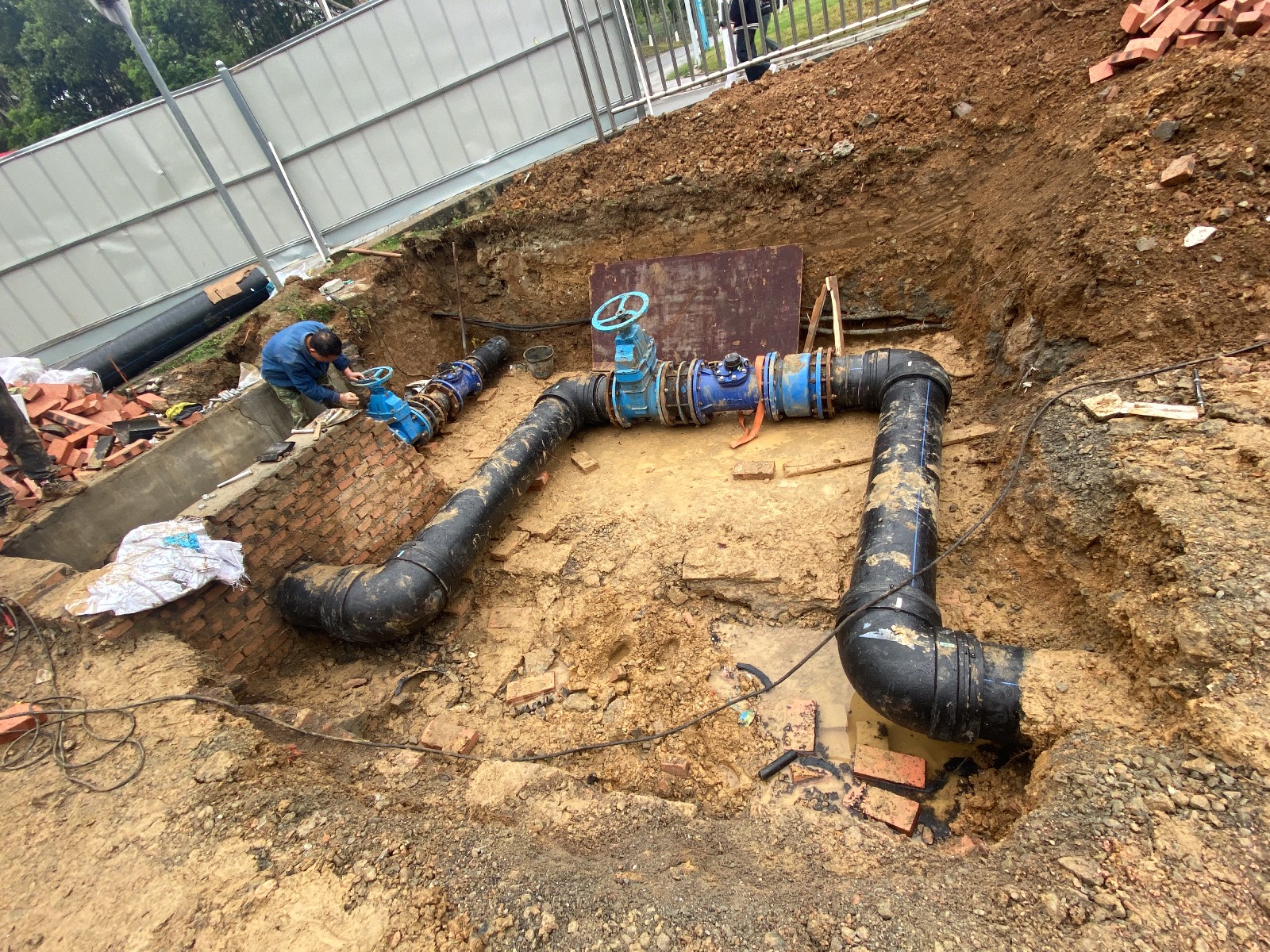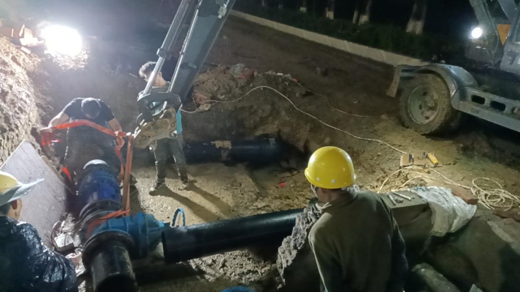 项目工作内容是学生公寓1栋出口给水井改造,涉及到一根DN315管道和一根DN200管道的改造,在已做好前置条件准备情况下,当天9点开始停水作业,由于管道内余水较多,施工过程中又开始下雨,使施工难度加大,最终在基建办的指挥和各施工人员密切配合下,将近18小时连续作业,于4月6日凌晨3:30分左右完成管道的改造,待管件完全冷却凝固后早晨6点40完成开闸送水,恢复教师公寓及学生公寓2栋供水。