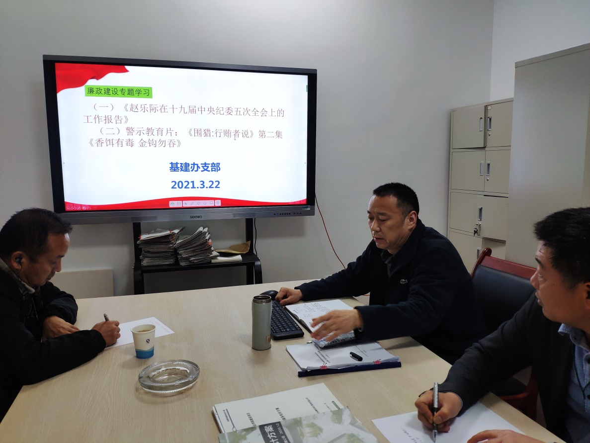基建办党支部于3月22日在行政楼201室召开支部会议,组织廉政警示教育学习。会议由支部书记杨晓荣同志主持。会议组织党员学习了赵乐际在十九届中央纪委五次全会上的工作报告—推动新时代纪检监察工作高质量发展以优异成绩庆祝中国共产党成立100周年。赵乐际在工作报告中首先回顾了2020年纪检监察工作:坚持不懈学懂弄通做实习近平新时代中国特色社会主义思想,自觉担负起“两个维护”重大政治责任;持之以恒落实中央八项规定精神,纠“四风”树新风并举深化作风建设;全面贯彻巡视工作方针,扎实履行政治巡视职能责任;推动“两个责任”一体履行,精准有力监督执纪执法;持续深化纪检监察体制改革,构建系统集成、协同高效监督机制;坚持一体推进不敢腐、不能腐、不想腐战略目标,不断提高治理腐败效能;推进规范化法治化建设,打造高素质专业化队伍。报告对2021年的纪检监察工作做出总安排:2021年纪检监察工作以习近平新时代中国特色社会主义思想为指导,全面贯彻党的十九大和十九届二中、三中、四中、五中全会精神,增强“四个意识”、坚定“四个自信”、做到“两个维护”,坚持稳中求进工作总基调,立足新发展阶段,贯彻新发展理念,构建新发展格局,以推动高质量发展为主题,坚定不移全面从严治党,坚持和完善党和国家监督体系,忠实履行党章和宪法赋予的职责,有力推动党中央决策部署有效落实,围绕现代化建设大局发挥监督保障执行、促进完善发展作用,一体推进不敢腐、不能腐、不想腐,深化纪检监察体制改革,扎实推进规范化法治化建设,切实加强干部队伍建设,为“十四五”开好局提供坚强保障,以优异成绩庆祝建党100周年。