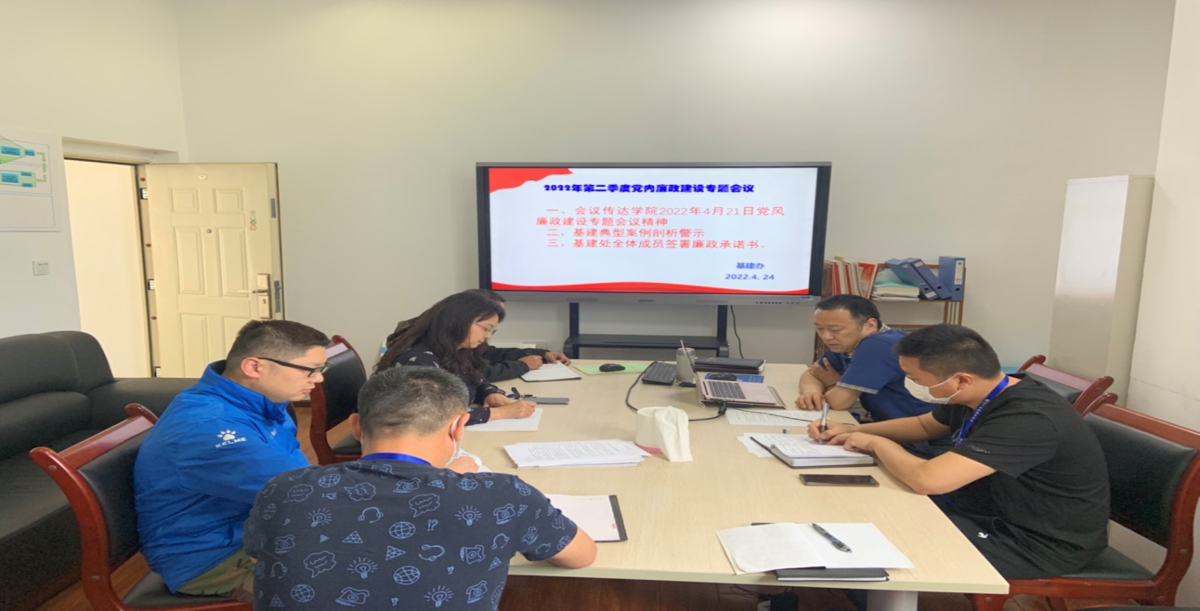 2022年4月24日下午,为不断提高基建办同志廉洁奉公的意识,筑牢拒腐防变的基建基石。在201会议室,基建办召开第二季度党风廉政建设专题会,会议由基建办处长、党支部书记杨晓荣同志主持,基建办全体同志参会。