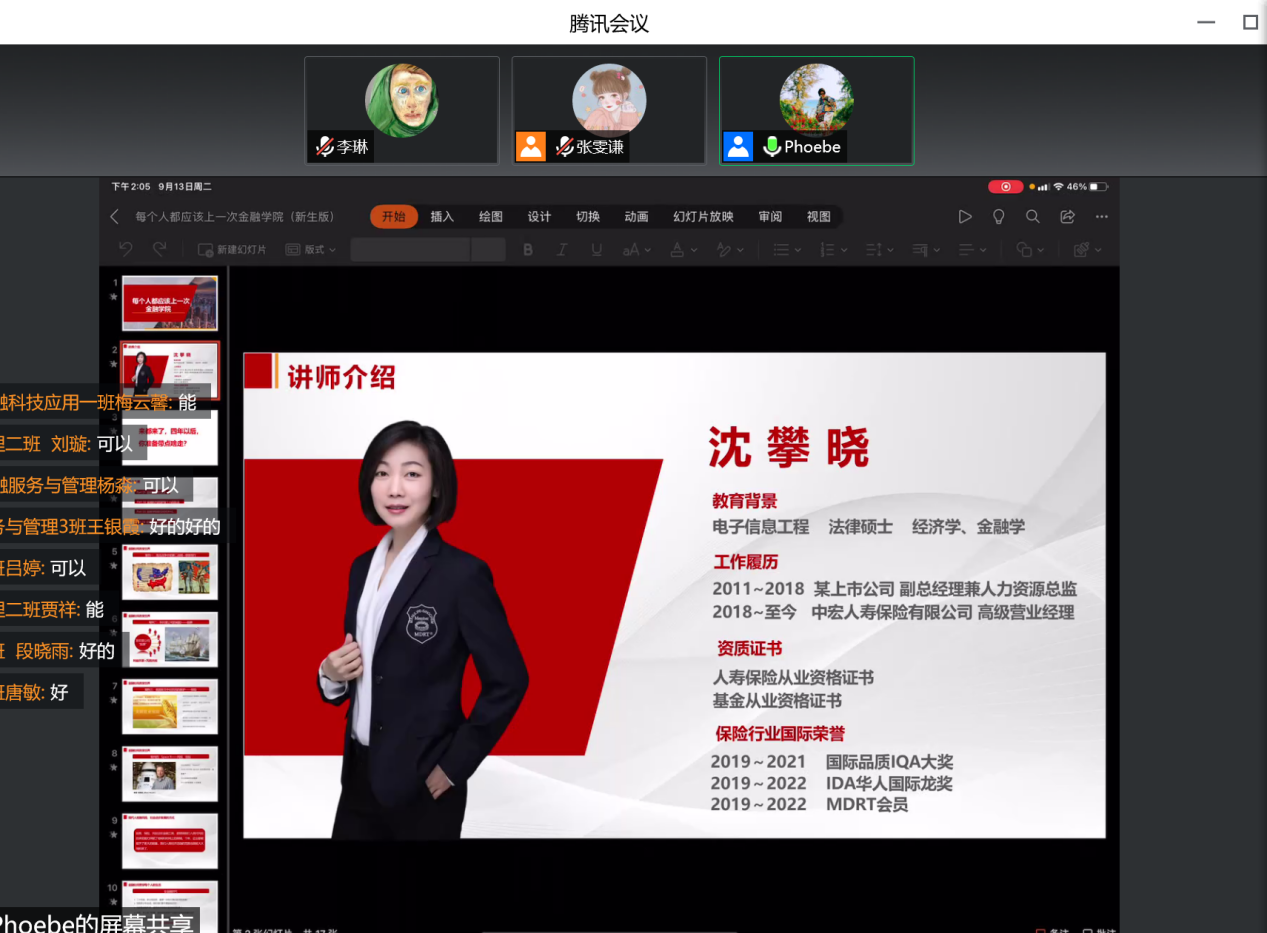 金融学院邀请到中宏人寿保险有限公司营业经理,国家二级人力资源管理师沈攀晓老师做客金融学院。沈老师从“金融如何改变世界”“金融如何贯穿每个人的生活”“金融学院能教给你什么”“金融小白的进阶之路”四个方面娓娓道来、由浅入深的讲授金融行业、金融工具、金融规则、金融学习。