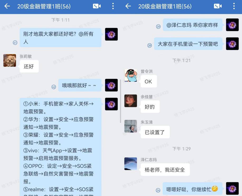9月5日,四川省甘孜州泸定县发生6.8级地震,财富管理教研室党支部组织教师快速反应“师生一心,共克时艰”,保证教学正常进行同时积极关心本专业学生。杨飞宇老师在第一时间排查关心灾区同学,在联系上甘孜藏族自治州的泽仁尼玛同学得知其安全后,对20级金融管理1班的学生作出避险指示,为学生做了地震预警、灾害应对等教育。