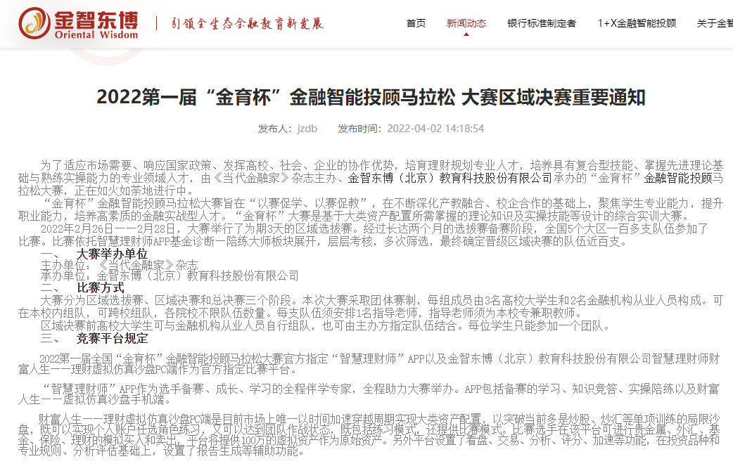 为使在年底的考试能够吸引更多的学生参与,今年4月我院积极组织学生参加《2022第一届“金育杯”金融智能投顾马拉松大赛》。目前,我院的参赛队伍均以优异成绩跻身全国总决赛。在此,也希望我们的参赛队伍能在总决赛中取得优异成绩,为年底的首次金融智能投顾职业技能证书(初级)考试进行预热。