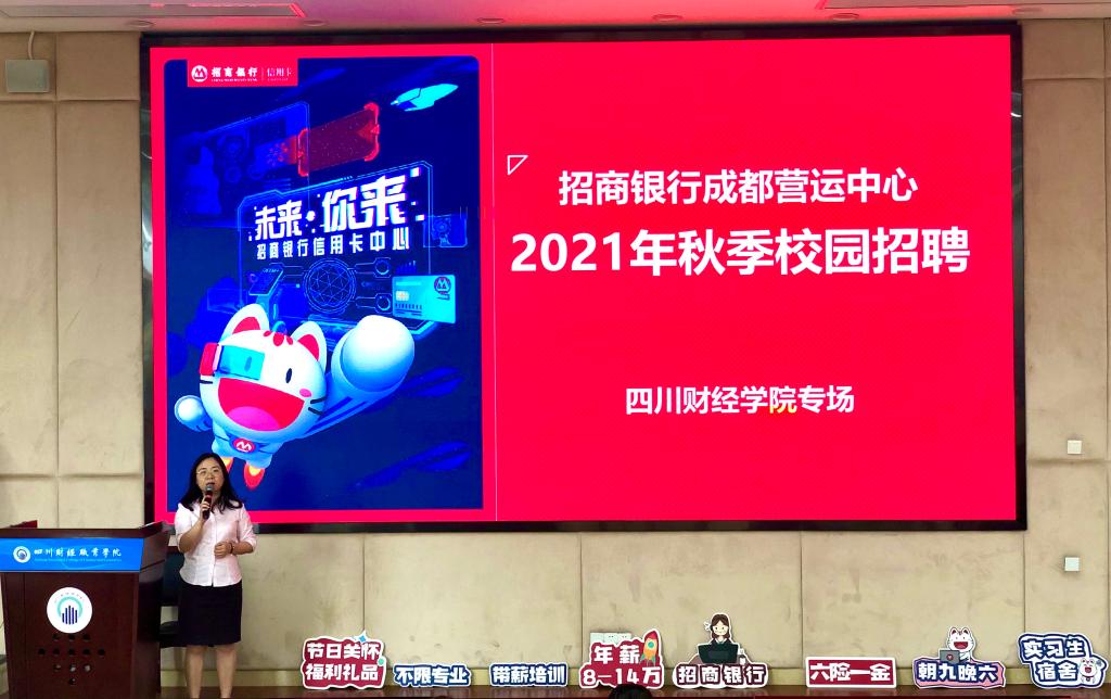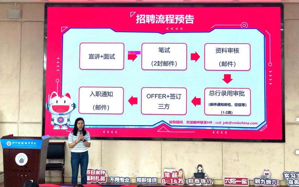仪式开始,戴文丽老师从工作岗位、工作性质、工作内容、工作环境及薪资待遇这五个方面为同学们详细介绍了招商银行成都营运中心。她提到,这是招商银行成都营运中心来到7790cnm必发集团进行校园招聘的第三年,我院学生在银行的工作态度认真负责,表现优秀。金融学院副院长李琳老师也在现场为同学们耐心地答疑解惑,鼓励他们勇于尝试,把握机会。