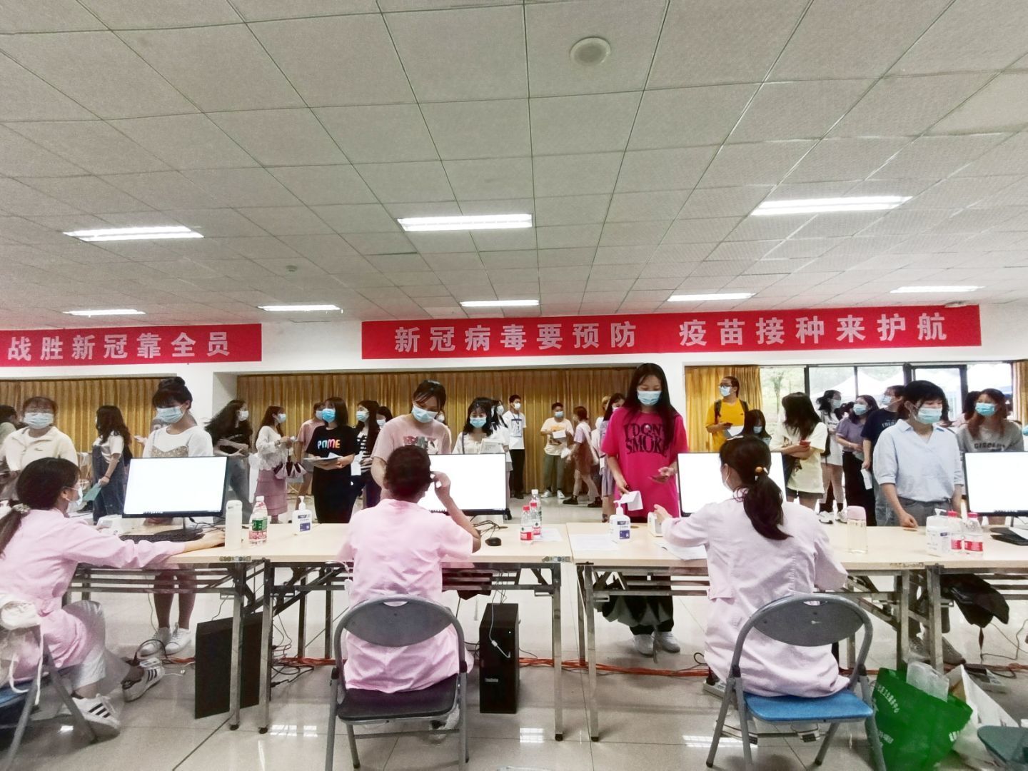 此次的疫苗接种总共分为四项工作流程,师生依次通过预检区、登记区、接种区、观察区。同学们到达体育馆后有序排队并分批进入进行预检,医务人员根据疫苗接种要求,询问师生接种禁忌情况,进行预检。符合接种条件的师生到登记区进行身份登记,登记后,志愿者引导每位师生到接种台进行疫苗接种,接种后分发接种时间标签,进入观察区等候30分钟,确认无不适反应后完成接种并离开。在各位师生们和医护人员们配合下,以极高的效率,三个小时内完成了十三个班600余人的接种工作。