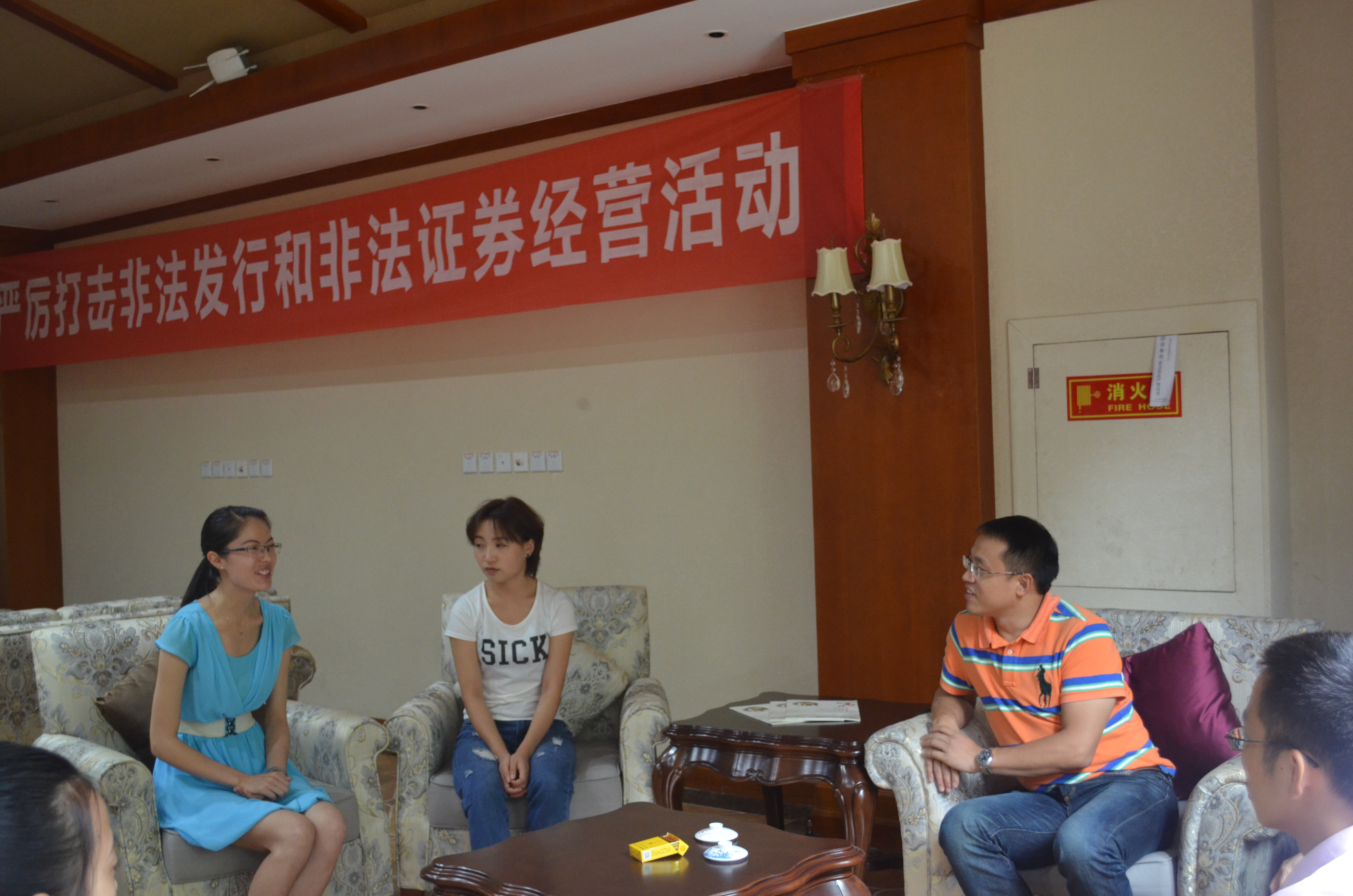 2016年6月24日下午2点,财税金融系主任钟用同志与财税金融系学生当支部书记李虹同志到达“五矿证券”公司。在那里我们见到了指导同学们的熊先生,4位我系14级金融专业的中期实习生与1位13级金融专业的顶岗实习生。