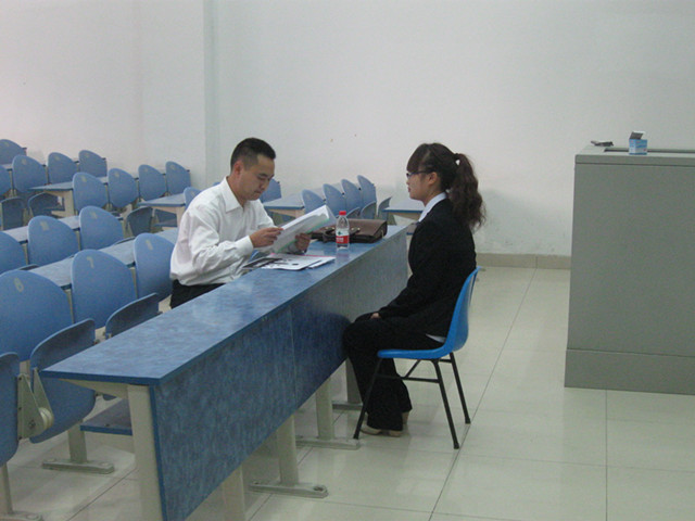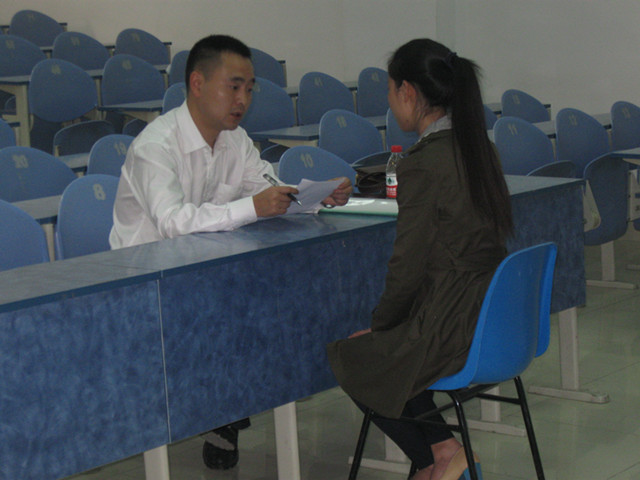 在工作人员的有序指导下,招聘进入一对一面试阶段,前来应聘的同学依次递交简历并进行面试,面试官根据专业需求对面试的学生抛出各种问题,面试的学生认真地回答问题。面试结束后,学院职业规划老师还向面试官咨询,在阵阵讨论声中,此次招聘会圆满结束。