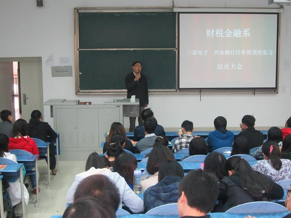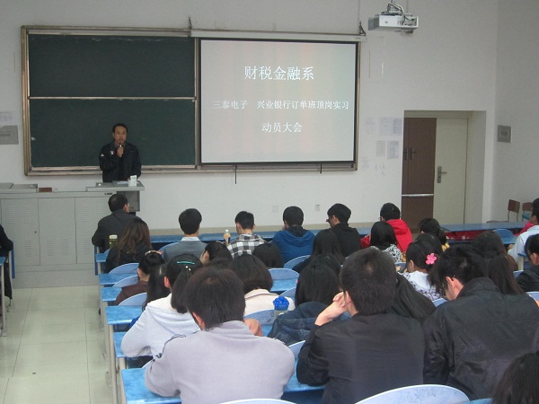 2011年10月25日中午13:00,我系在B209隆重召开三泰电子、兴业银行订单班实习动员大会。财税金融系主任钟用、党支部书记祝刚、团总支书记李虹出席此次会议。我系09级全体学生参加会议。