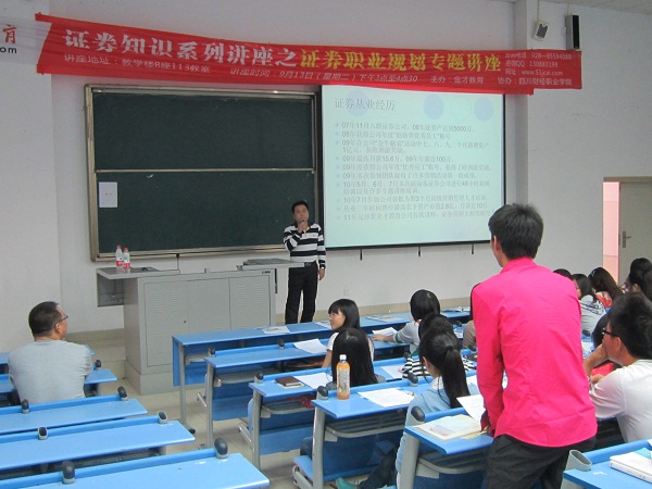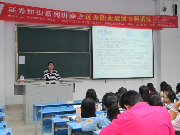 为了让同学们对证券行业有一个系统、全面的了解,2011年9月13日下午15:00,我系邀请到金才教育的专业人士在B113教室举办证券知识系列讲座之“证券职业规划专题讲座”,为我系同学讲解有关知识。