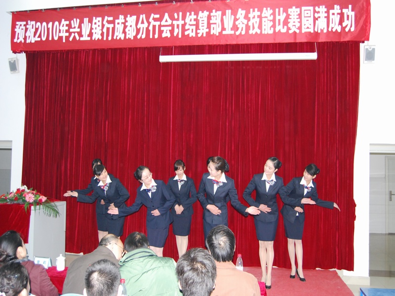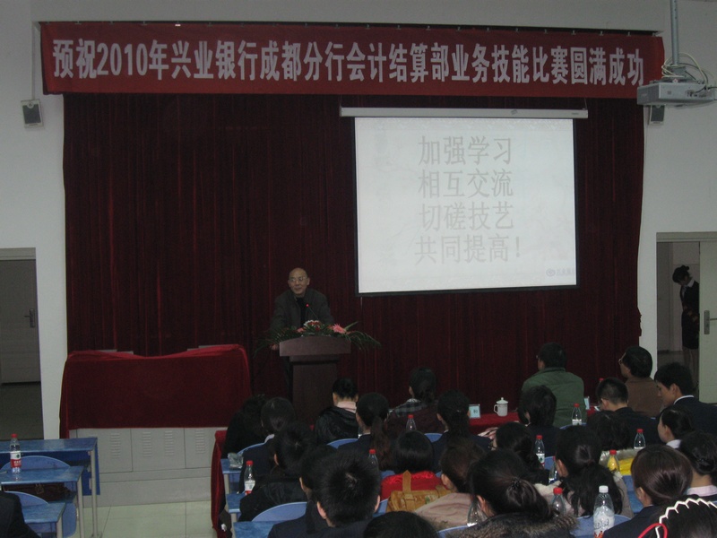 2010年11月28日早上9点,兴业银行成都分行会计结算部业务技能大赛开幕式在我院B211隆重举行。担任此次开幕式的嘉宾有兴业银行成都分行总经理张畅女士、总经理助理张敏敏女士、人事科科长曾莉女士,以及我院副院长余坤和同志、财税金融系系主任钟用同志、系党支部书记祝刚同志,同时参加此次开幕式的还有兴业银行会计结算部的全体成员和财税金融系的部分同学。