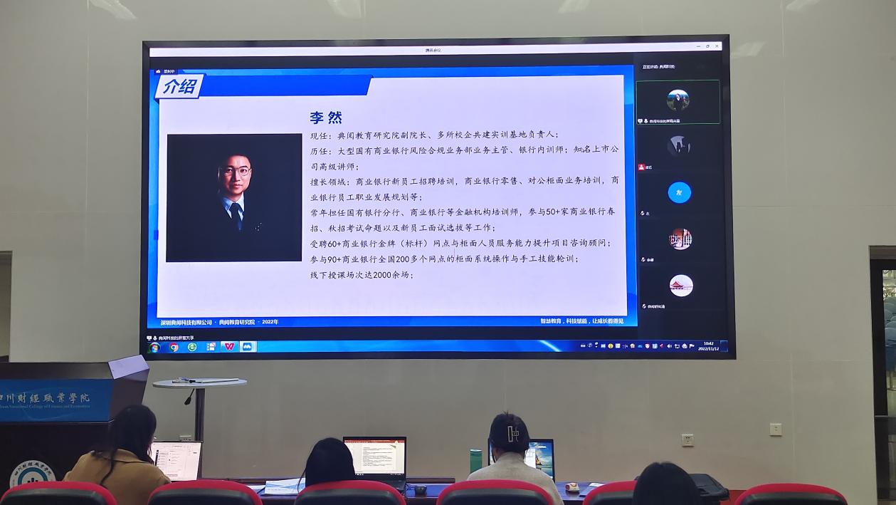11月12日上午,在四川省银行综合技能大赛期间,金融学院协同李琳名师工作室在B210展开数字化金融人才培养研讨会。此次会议由金融科技教研室主任李馨老师主持,参加此次会议的有各职业院校领队、指导老师和金融学院全体专任教师。本次研讨会采取线上与线下相结合的方式,同时通过“腾讯会议”在线上同步开展。